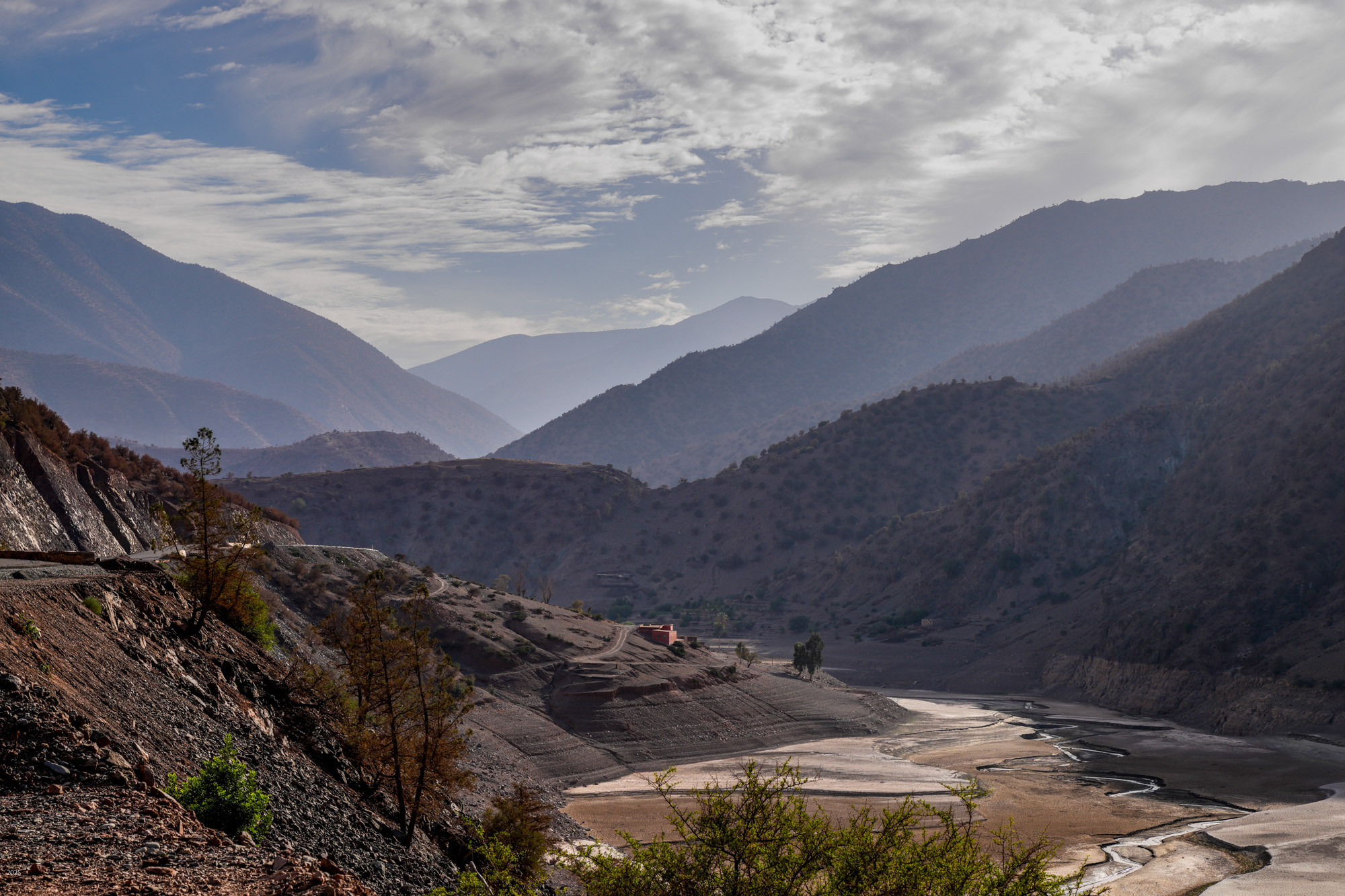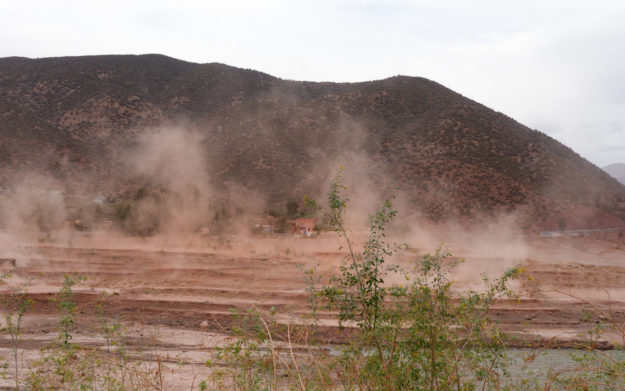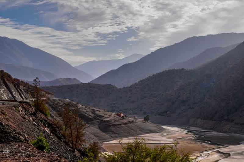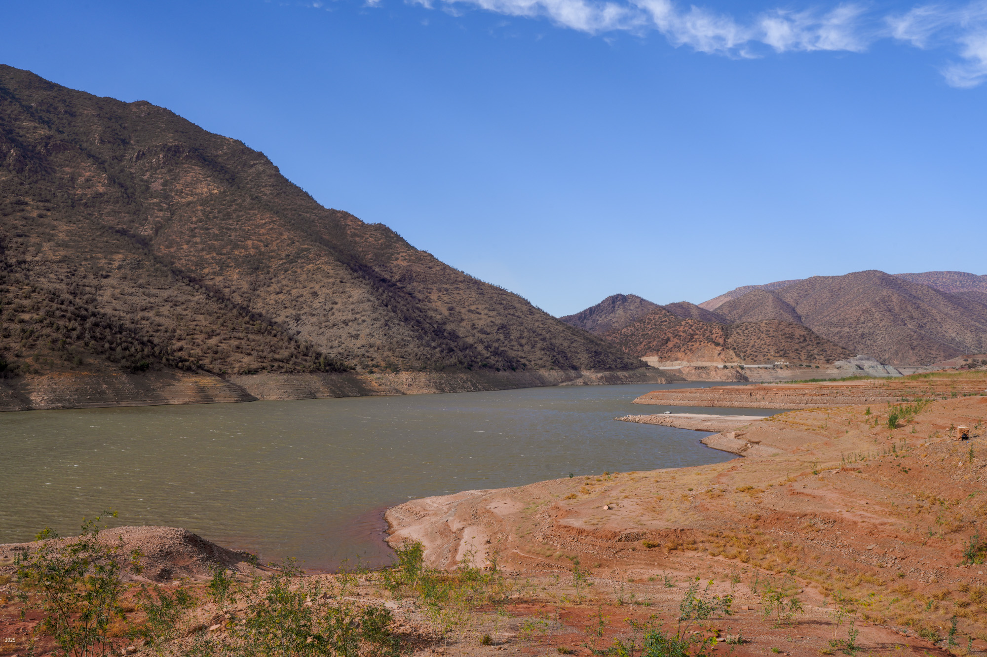 The N'fis river flows along the west edge of Ouirgane. When it emerges from the mountains into the plains, it feeds the Takerkoust Reservoir. This was built in 1935 to serve the water needs of Marrakech and the surrounding fertile plains. Over the years, the Takerkoust Reservoir was getting silted up. To control the influx of silt, in 2008 the Yacoub el Mansour Dam was built near Ouirgane. Also called the Ouirgane Dam, the resulting reservoir forms a scenic backdrop for the town. It provides some recreation with fishing, boating and hiking trails along its banks. Due to the 7 years of drought, the reservoir is far below its maximum level. Expanses of red mud are exposed and winds whip up clouds of dust.