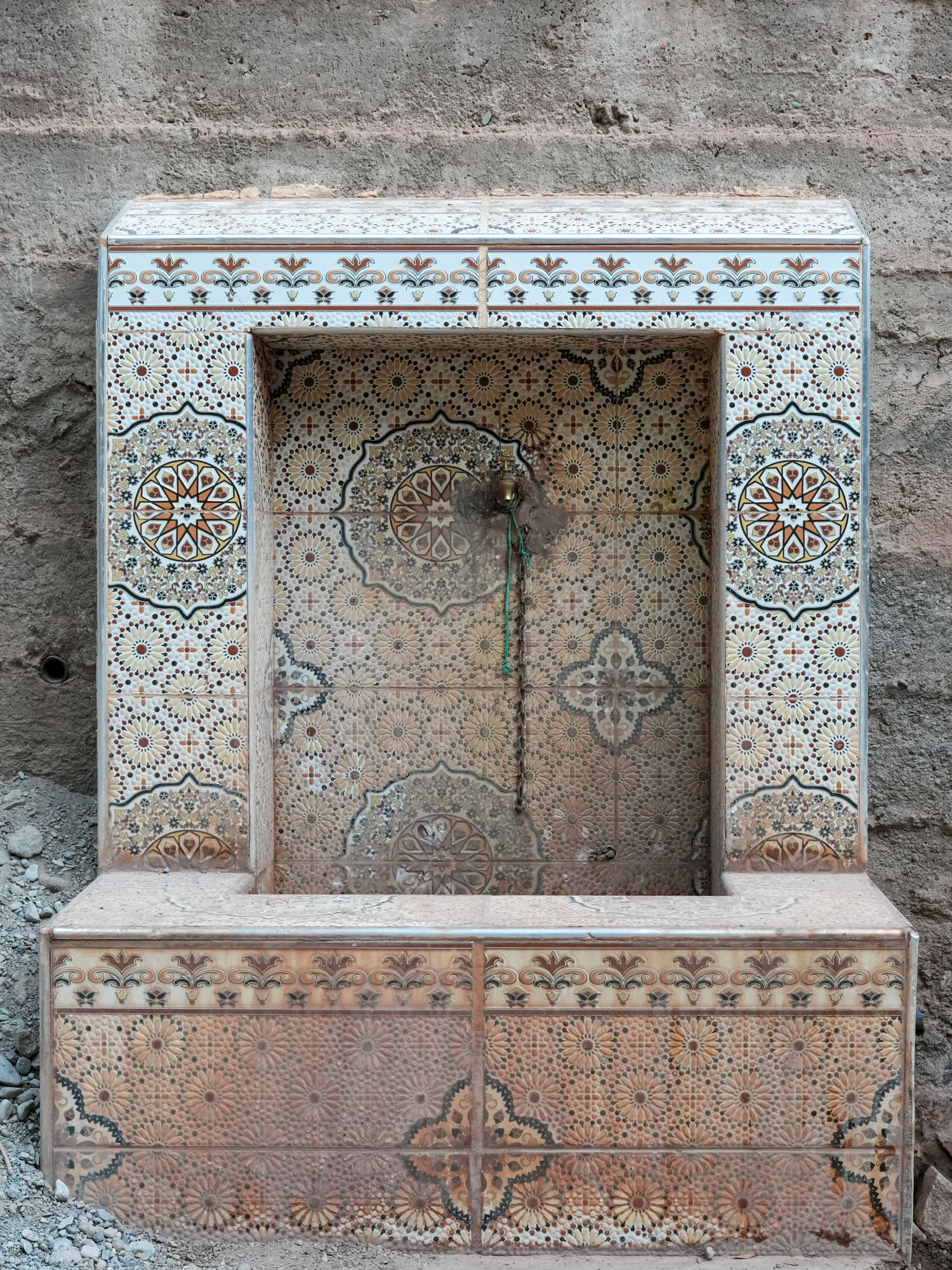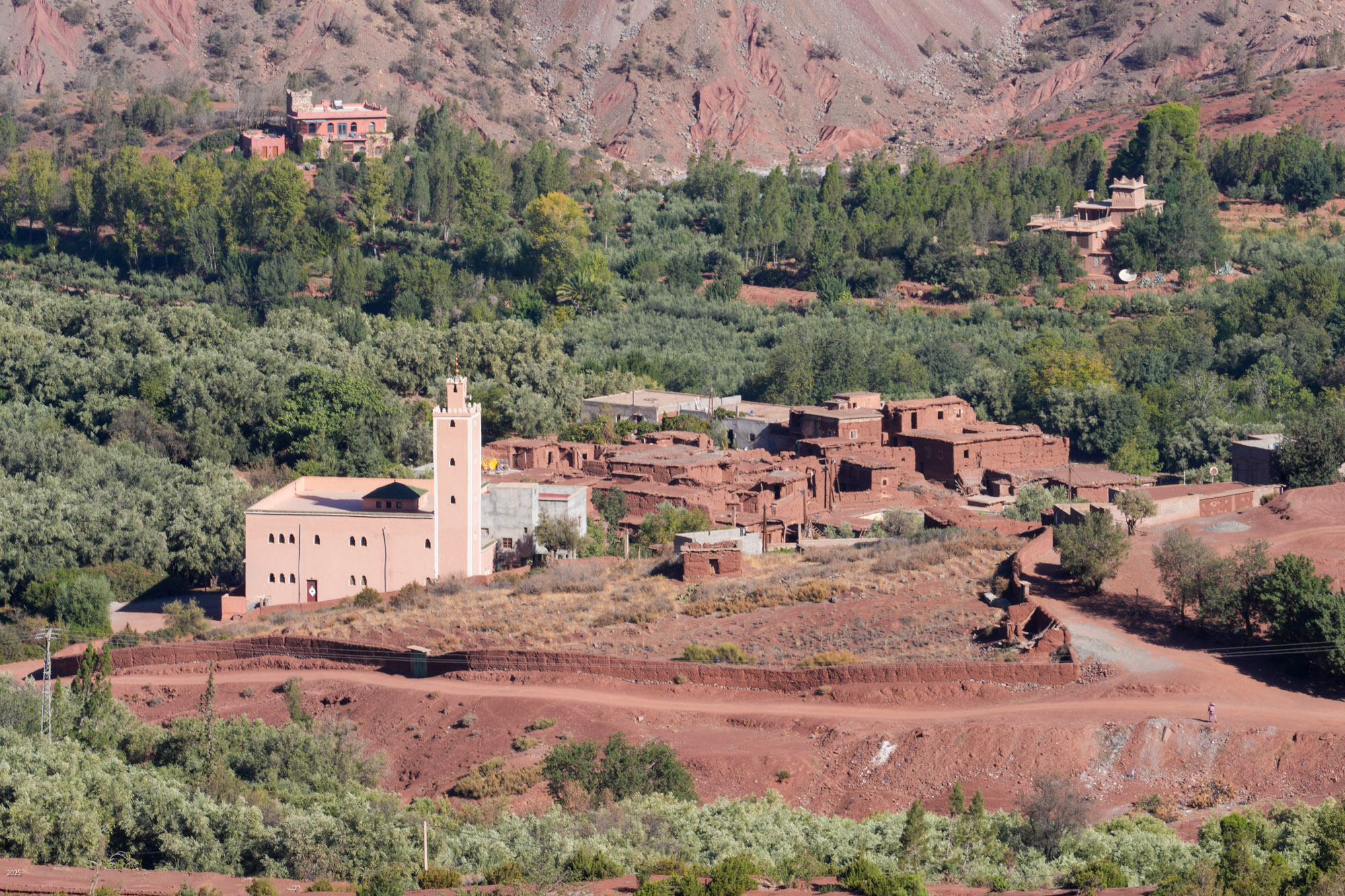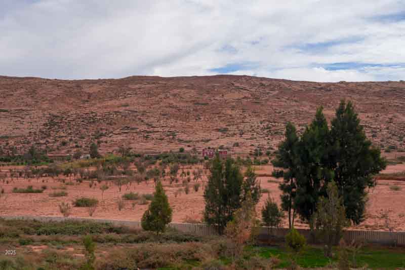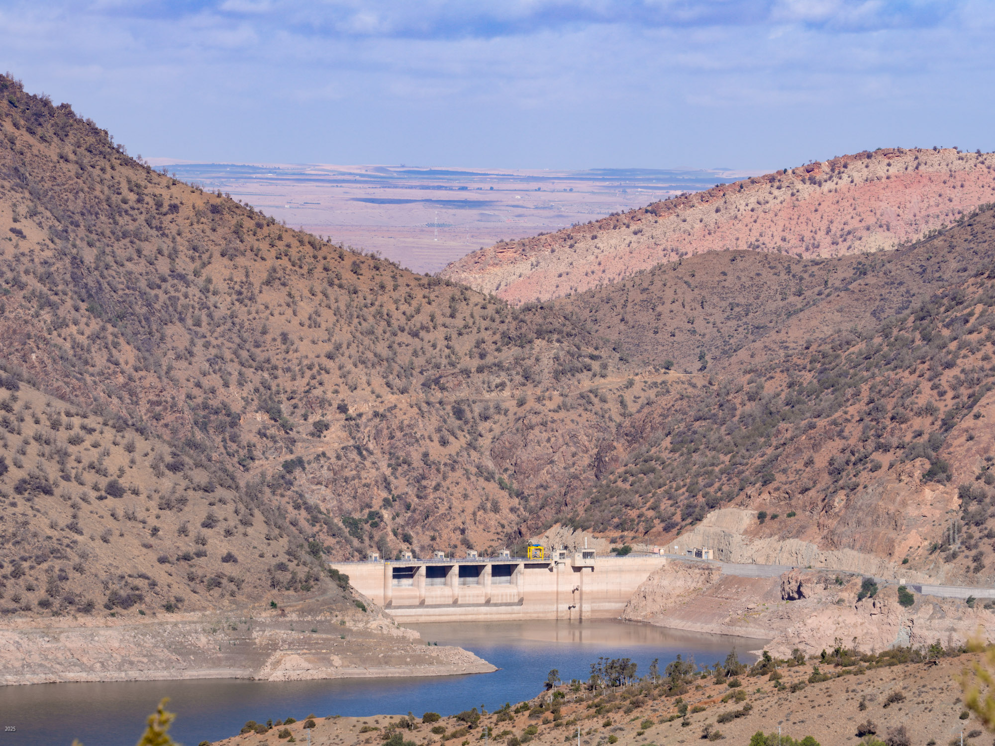 The N'fis river flows along the west edge of Ouirgane. When it emerges from the mountains into the plains, it feeds the Takerkoust Reservoir. This was built in 1935 to serve the water needs of Marrakech and the surrounding fertile plains. Over the years, the Takerkoust Reservoir was getting silted up. To control the influx of silt, in 2008 the Yacoub el Mansour Dam was built near Ouirgane. Also called the Ouirgane Dam, the resulting reservoir forms a scenic backdrop for the town. It provides some recreation with fishing, boating and hiking trails along its banks. Due to the 7 years of drought, the reservoir is far below its maximum level. Expanses of red mud are exposed and winds whip up clouds of dust.