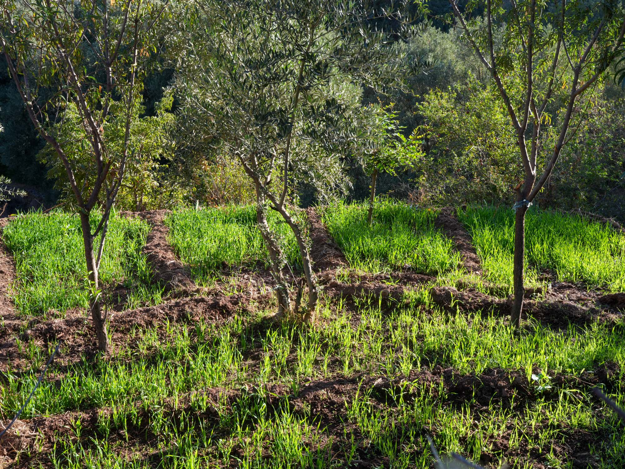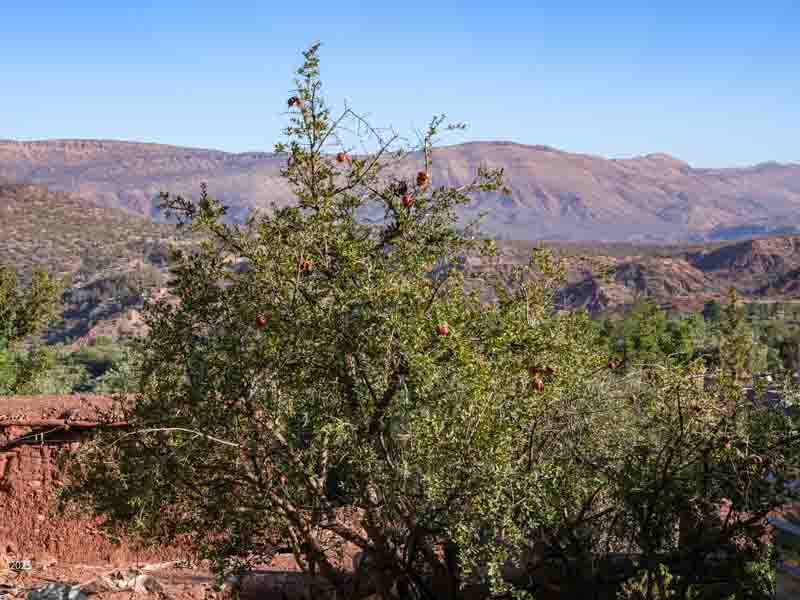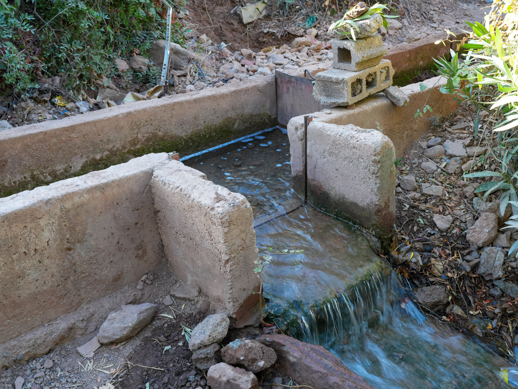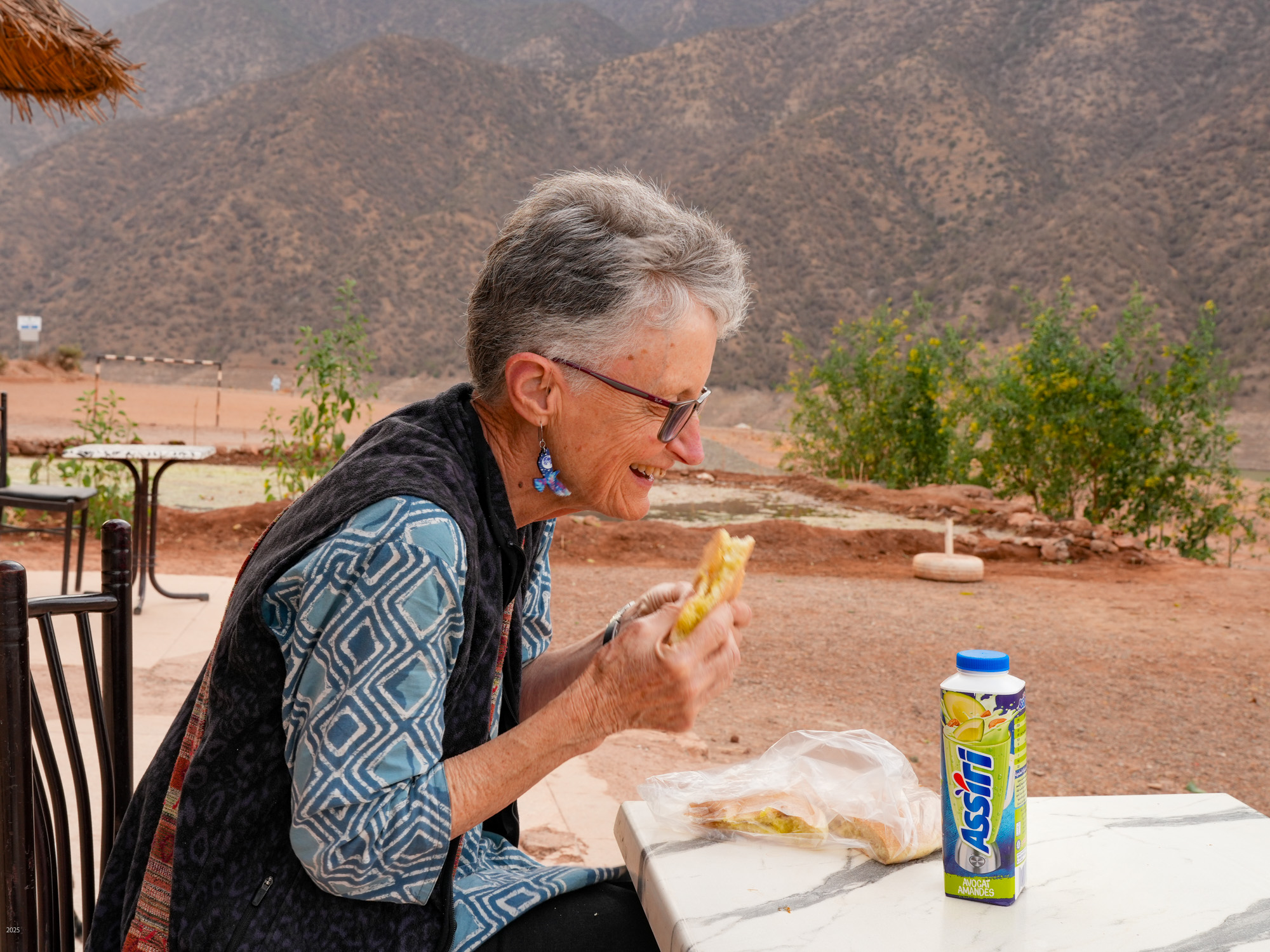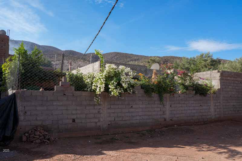 Behind the alleyways the paths climb past olive groves bordered by communal irrigation channels. Near Agouni we saw a few small patches of wheat. Our host said that because of the drought they had had several years of poor harvests, but 2024 had been better. The olives and olive oil are delicious. We had olives every morning with our breakfast of msemen (a sweet paratha), bread, omelette, cheese and honey. The area also usually produces good honey, but because of the drought and the paucity of flowers, the bees are now being fed sugar. Tajine with bread and salad is the standard lunch. As we prefer a light dinner we settled on bread with the lovely olive oil, yogurt and fruit for dinner.