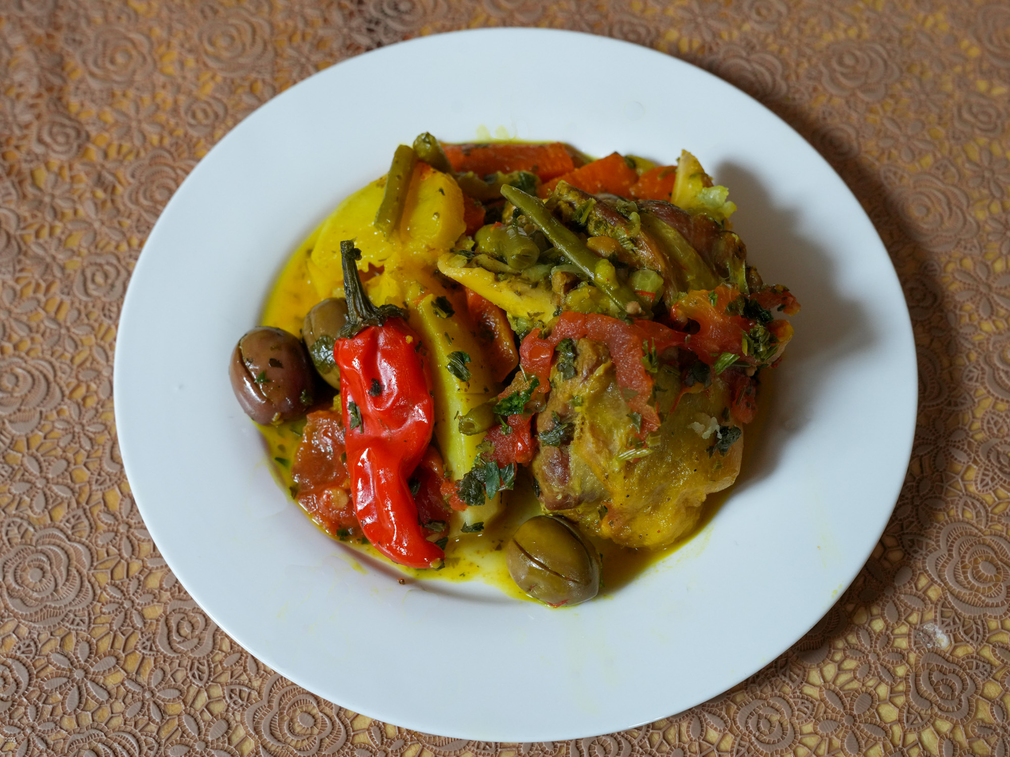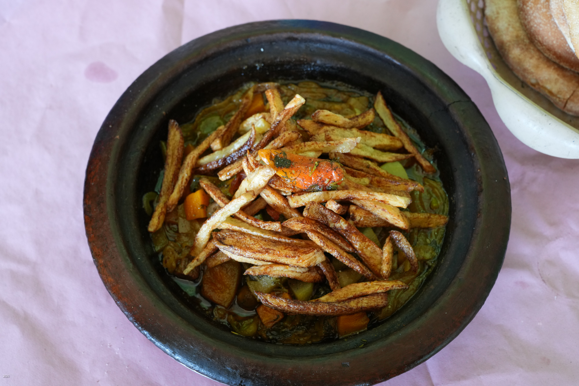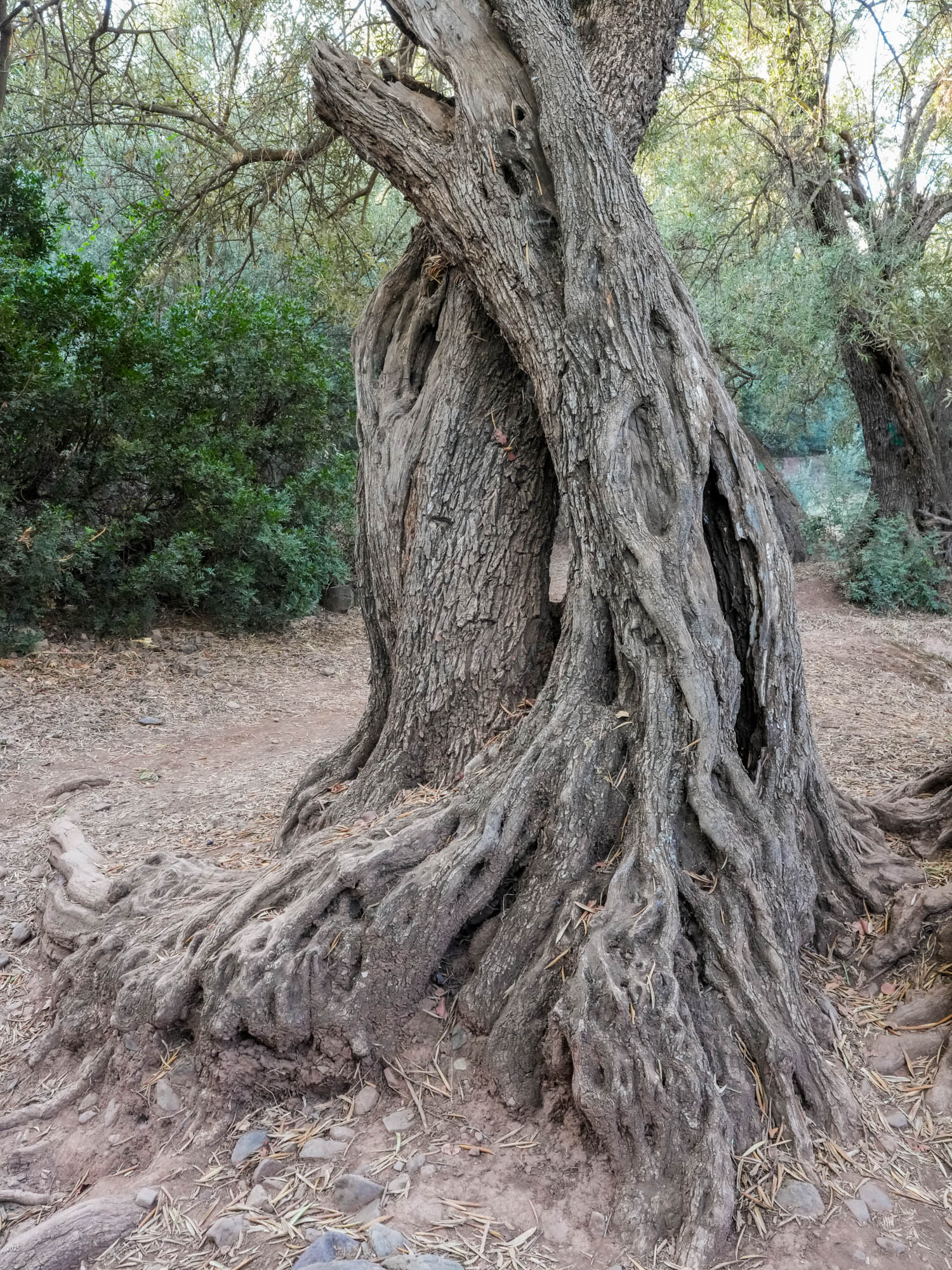 Behind the alleyways the paths climb past olive groves bordered by communal irrigation channels. Near Agouni we saw a few small patches of wheat. Our host said that because of the drought they had had several years of poor harvests, but 2024 had been better. The olives and olive oil are delicious. We had olives every morning with our breakfast of msemen (a sweet paratha), bread, omelette, cheese and honey. The area also usually produces good honey, but because of the drought and the paucity of flowers, the bees are now being fed sugar. Tajine with bread and salad is the standard lunch. As we prefer a light dinner we settled on bread with the lovely olive oil, yogurt and fruit for dinner.