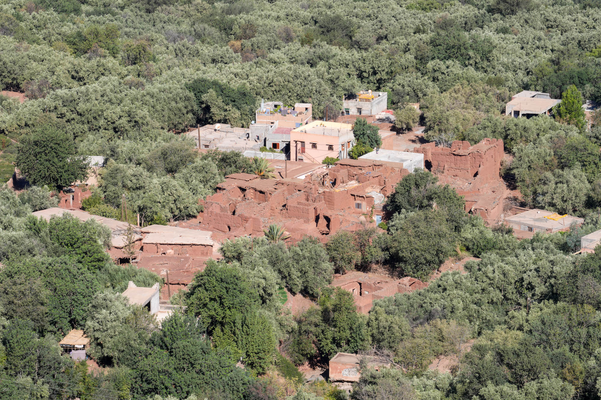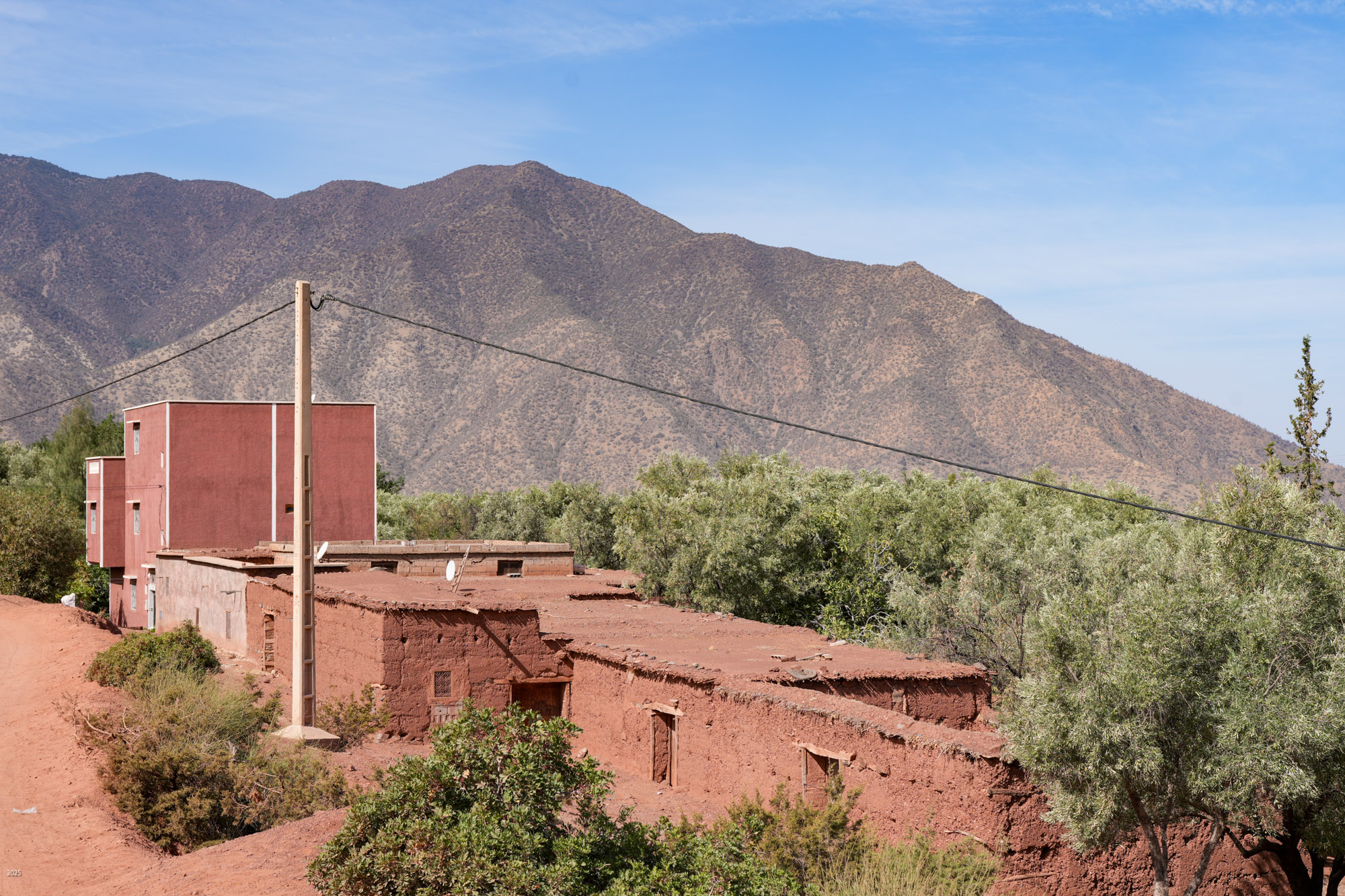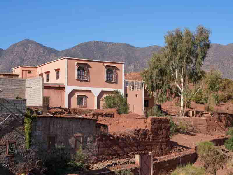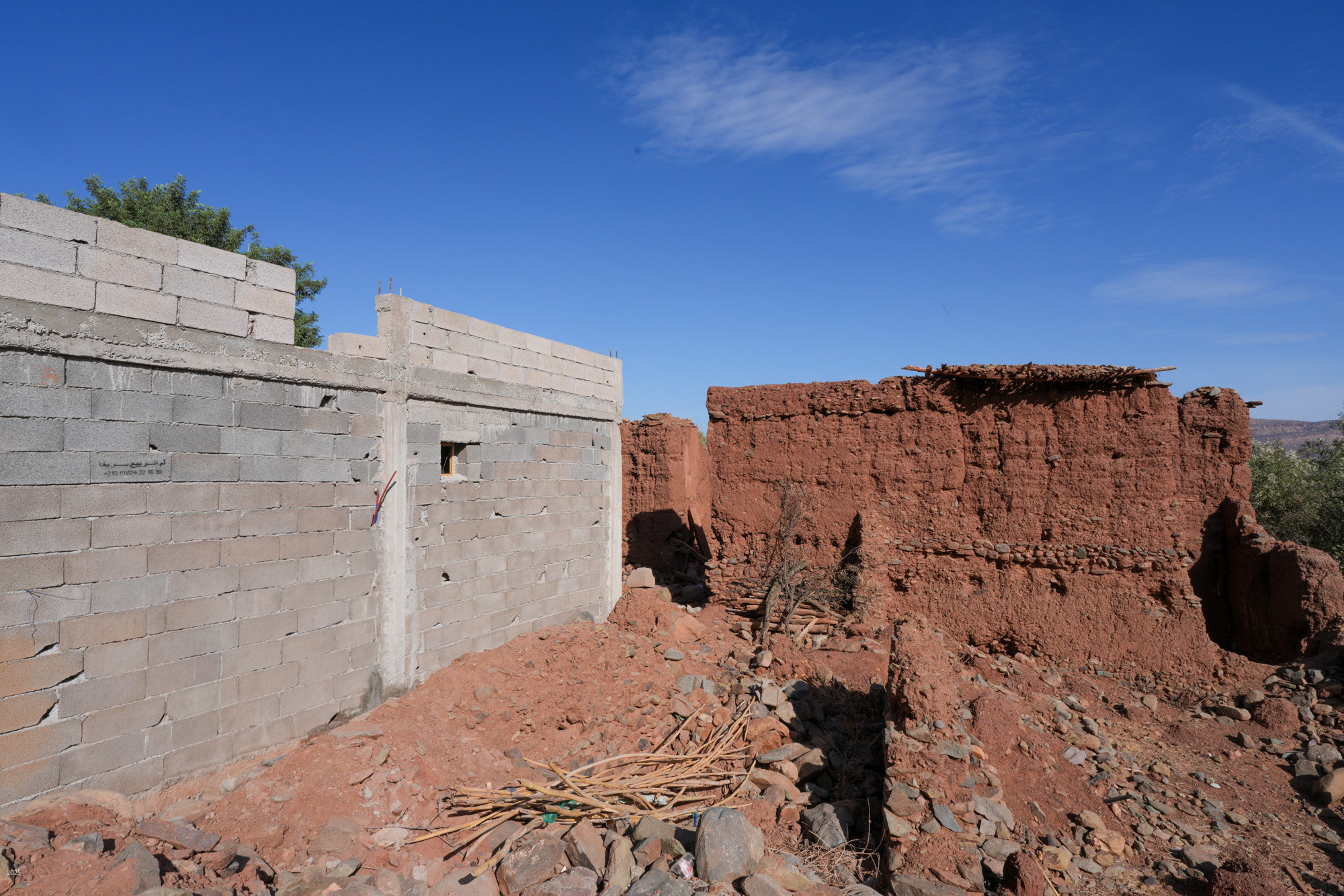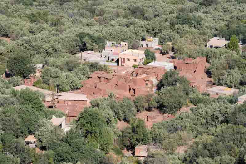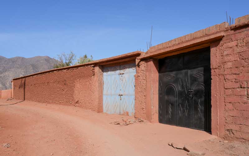 Walking through olive groves above Riad Idar for ~1 km, we came upon the Berber village of Agouni. Most of the old houses were destroyed in the 2023 earthquake. The village has many modern houses, similar in form to the old ones, but built with concrete structures and walls of hollow blocks.