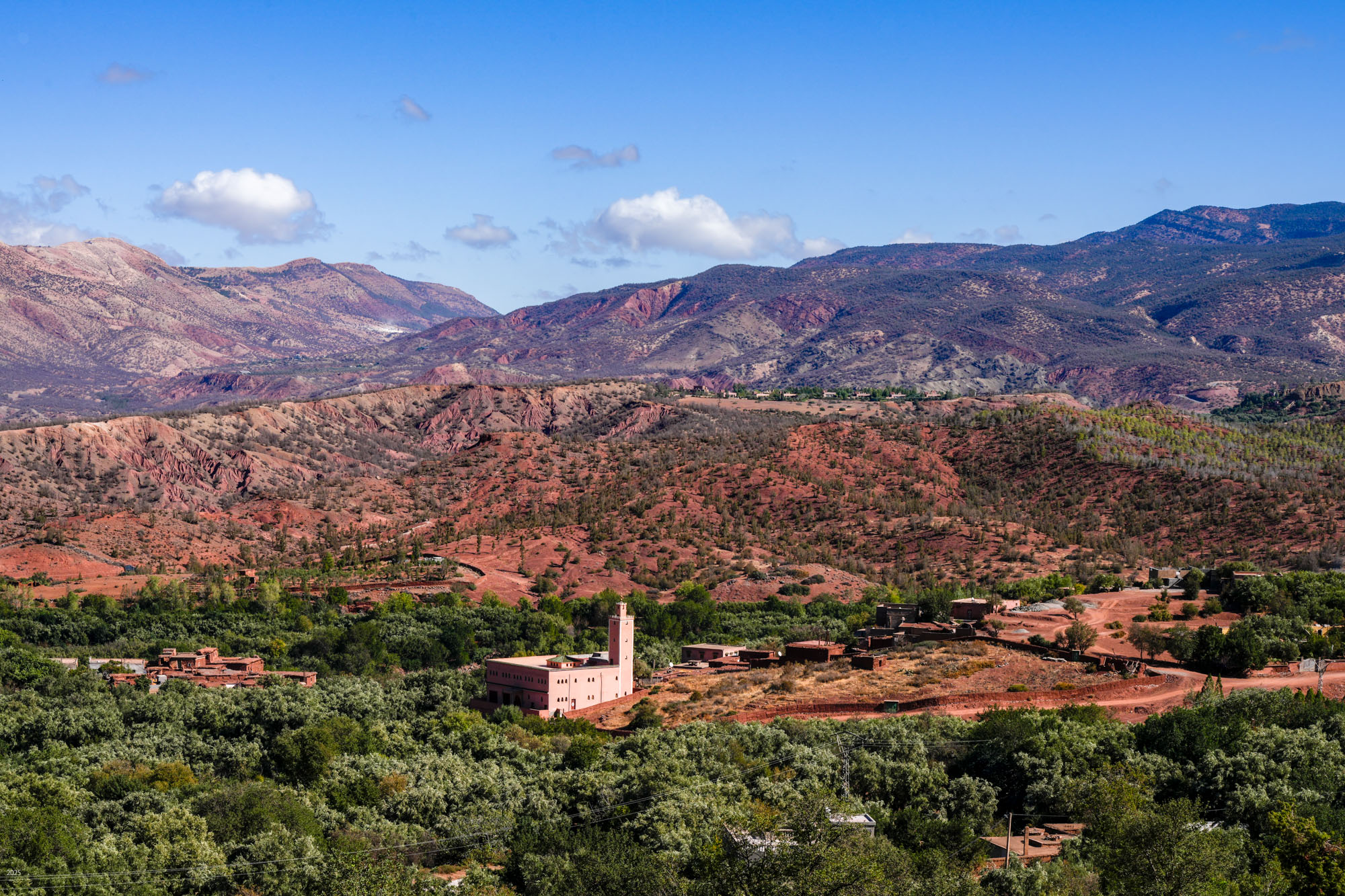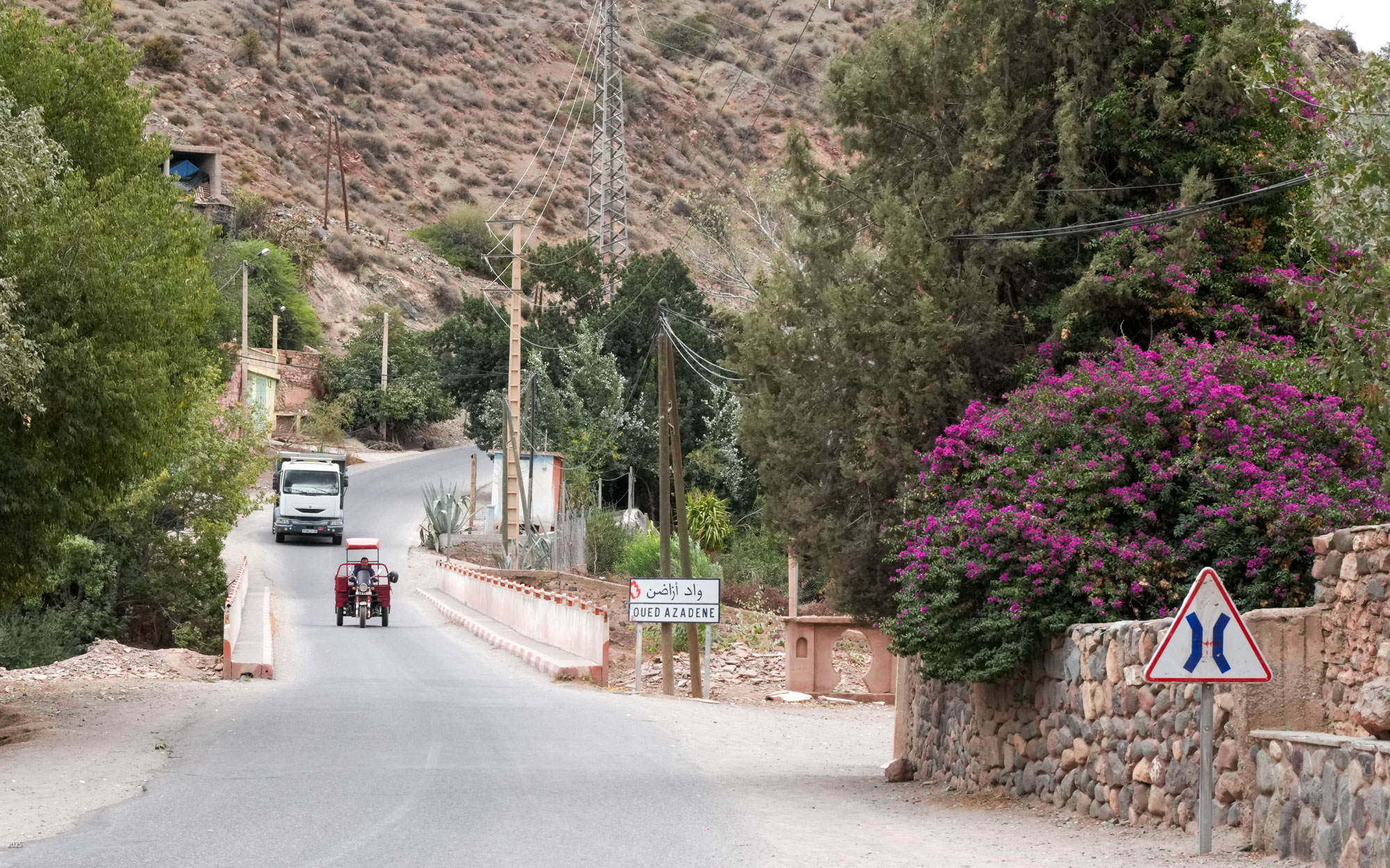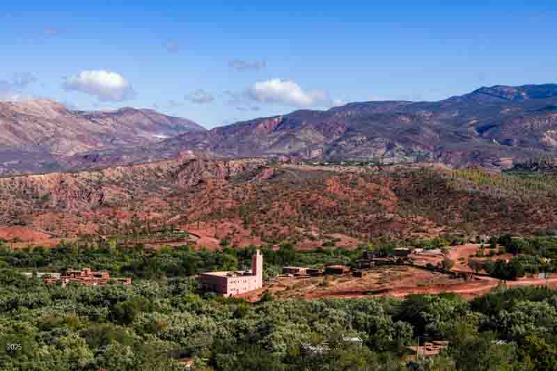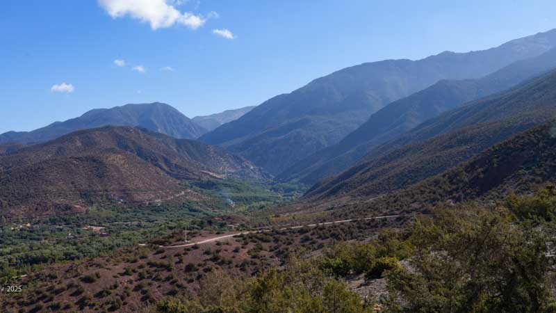 Ouirgane is a peaceful and friendly Berber village situated in a narrow valley in the Western High Atlas mountains. It lies about 40 kilometres northwest of Morocco's highest peak, Jbel Toubkal and just 63 kilometres south of Marrakesh. It offers a cooler climate, and in 2008 the Yacoub el Mansour dam was constructed below the town adding tranquil vistas of the reservoir. It is a very popular retreat for Marrakesh residents during the summer. When we visited in October, we found it very quiet.