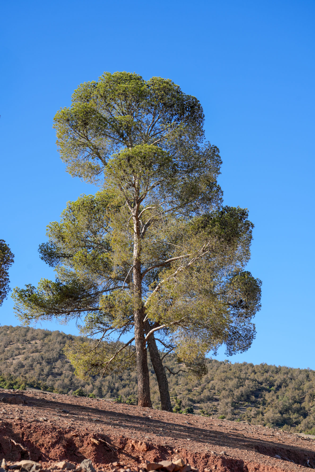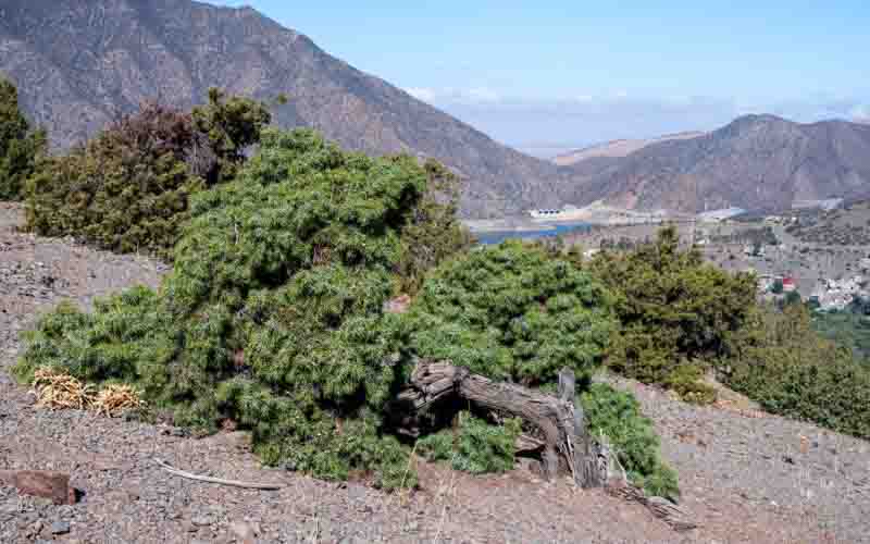 Above Agouni, we took a dirt road to the left to reach Anraz village after ~1 km. Anraz has a prominent mosque set amidst old and new buildings. The village is surrounded by olive groves. We climbed the road above Anraz to reach a prominence about 600' above Ouirgane. We had a snack while savouring the panoramic views. Below us were Agouni and Ouirgane, the reservoir and dam with a steep hill on the far side of the reservoir. To the left, the Anraz mosque stood out against the ridge rising up to the high range behind us. Olive groves carpeted the valleys and lower slopes. The upper slopes were sparsely forested with a few pines, stunted juniper and other shrubs. The vistas were a mix of browns, vivid reds, green and purple, under a blue sky, accentuated by unusual showers the previous night.