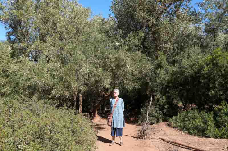 Riad Idar is a small guest house with just two bedrooms and a large common room upstairs. The family lives downstairs. Located just a block off the highway in an olive grove, it was a lovely, peaceful place to stay. Our host was very informative about trails and looked after our every need, while his wife and mother provided us with delicious meals. A nearby cock was the only thing to disturb the tranquility. At the end of October, with daylight savings time, the sun rose over the mountains to the east only after eight, but the cock arose much earlier and crowed vociferously at regular intervals throughout the day.