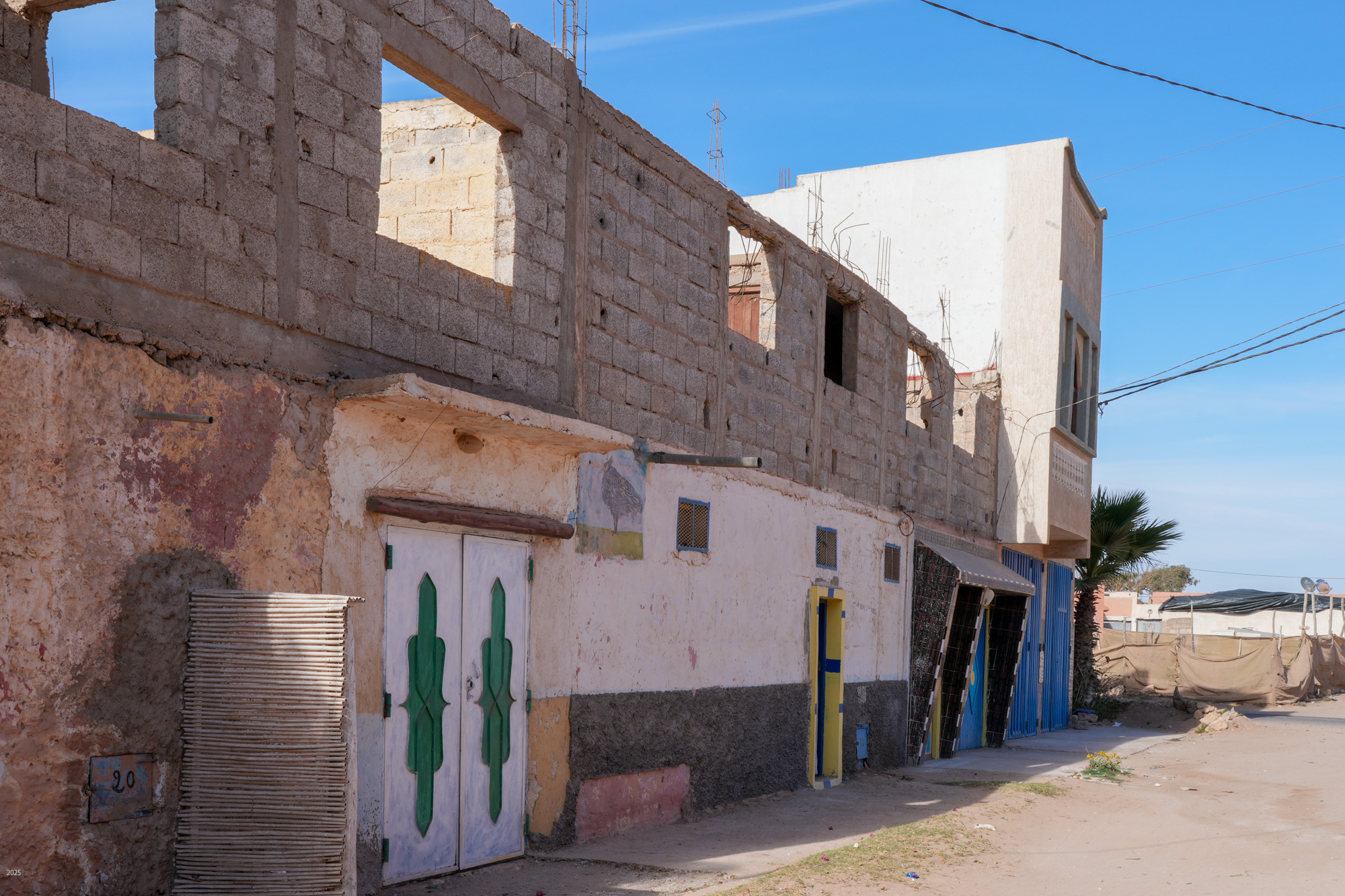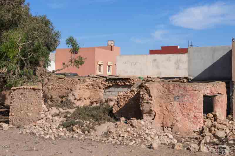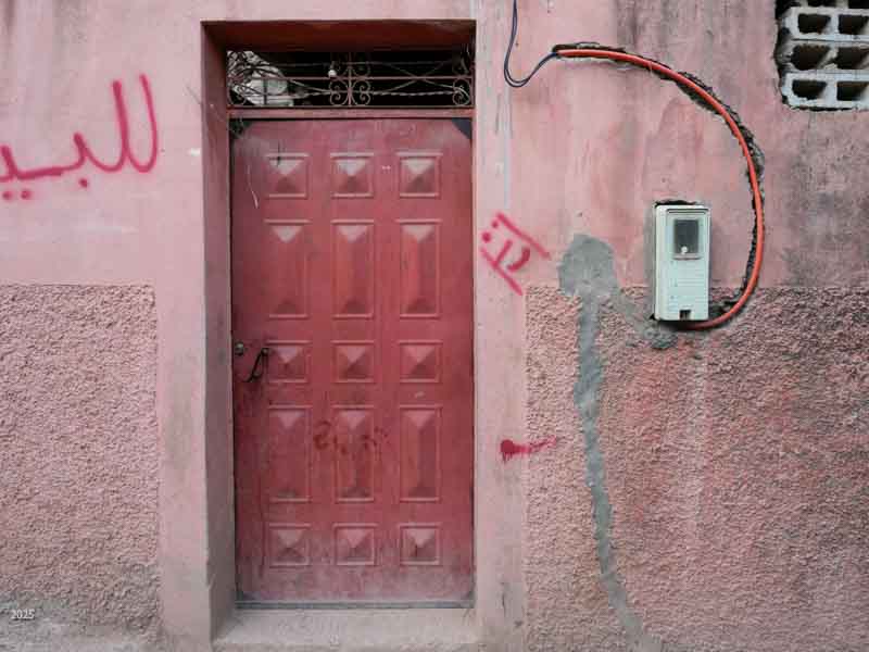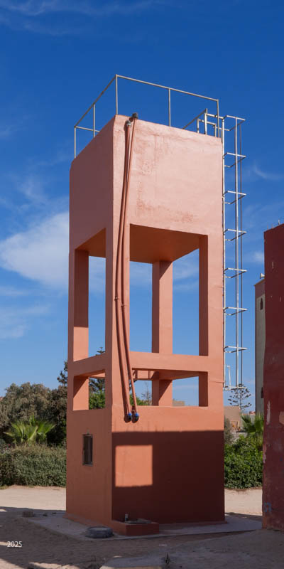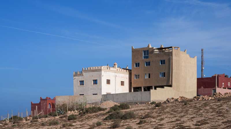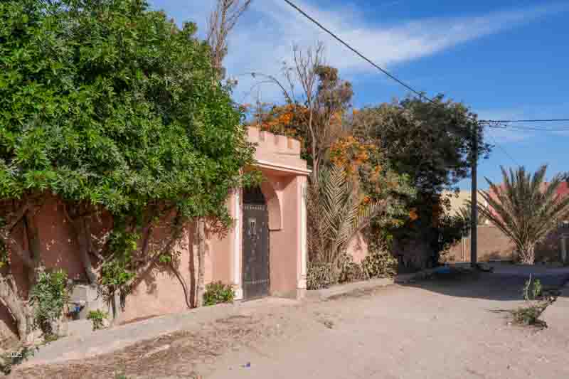 Most buildings in rural Morocco are rectangular. The walls and roofs are flat, and the angles between walls and roofs are all 90º. This is easier to construct using stones and mud mortar, and it is a more efficient use of space. Buildings are surrounded by a high compound wall with a solid door and no windows. The exterior walls of the buildings have few windows. The more affluent have shrubs and trees along the boundary for further privacy. The electricity meter is mounted on the outside of the compound wall next to the door.