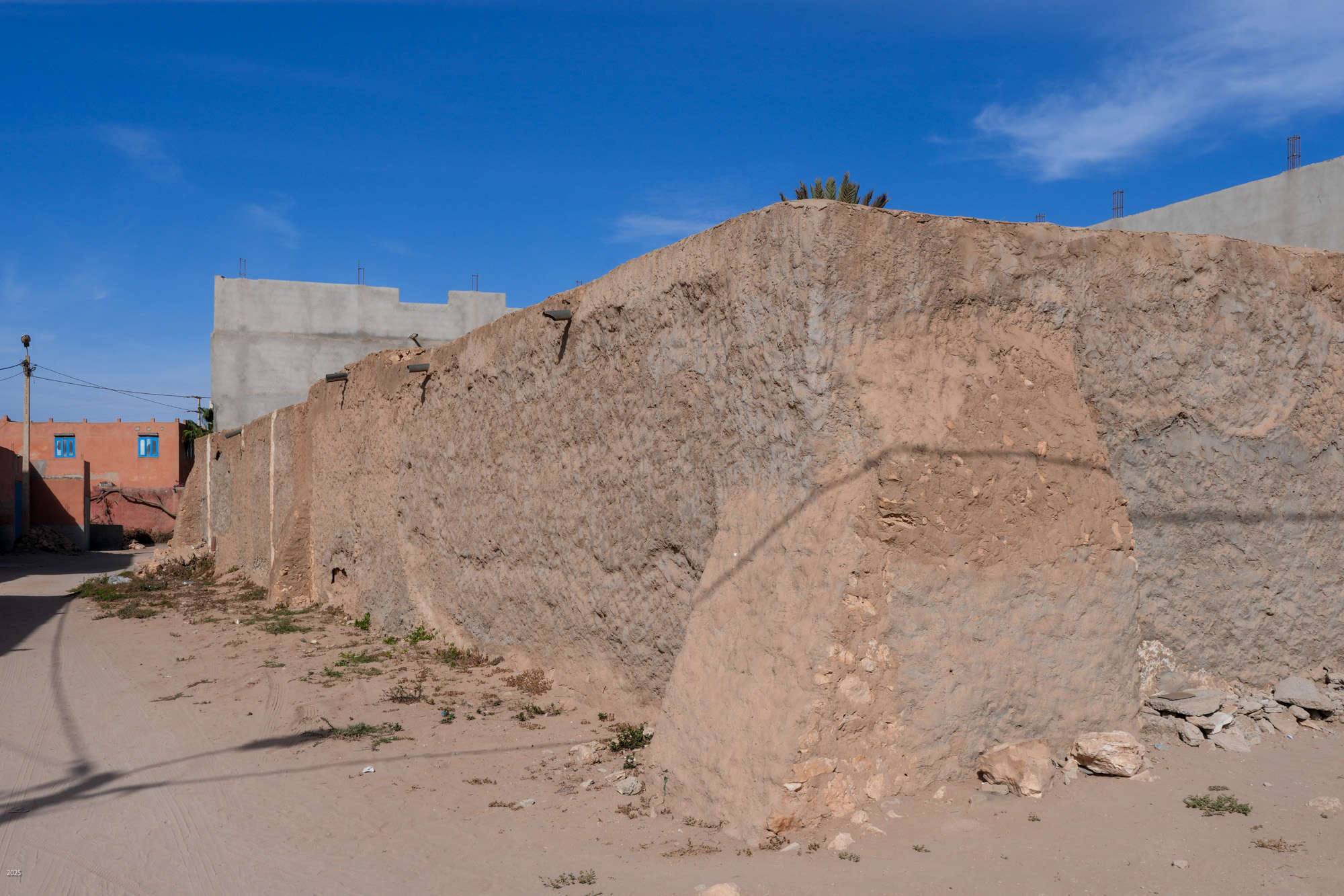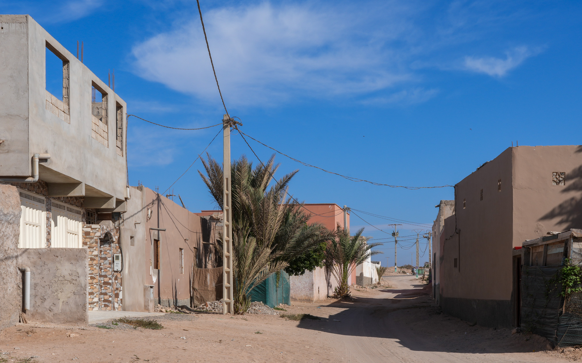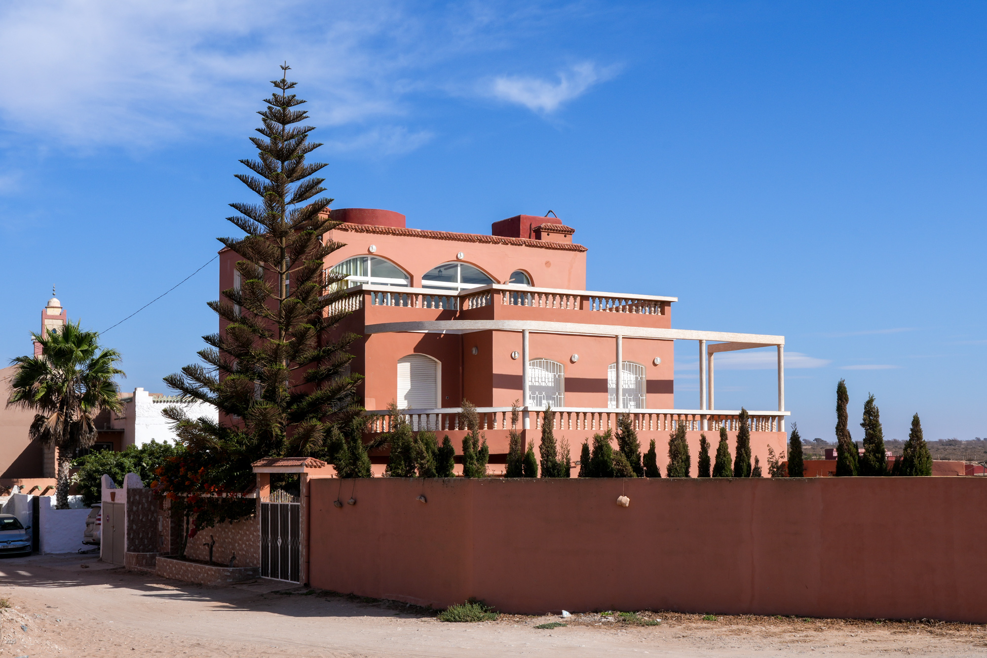Most buildings in rural Morocco are rectangular. The walls and roofs are flat, and the angles between walls and roofs are all 90º. This is easier to construct using stones and mud mortar, and it is a more efficient use of space. Buildings are surrounded by a high compound wall with a solid door and no windows. The exterior walls of the buildings have few windows. The more affluent have shrubs and trees along the boundary for further privacy. The electricity meter is mounted on the outside of the compound wall next to the door.