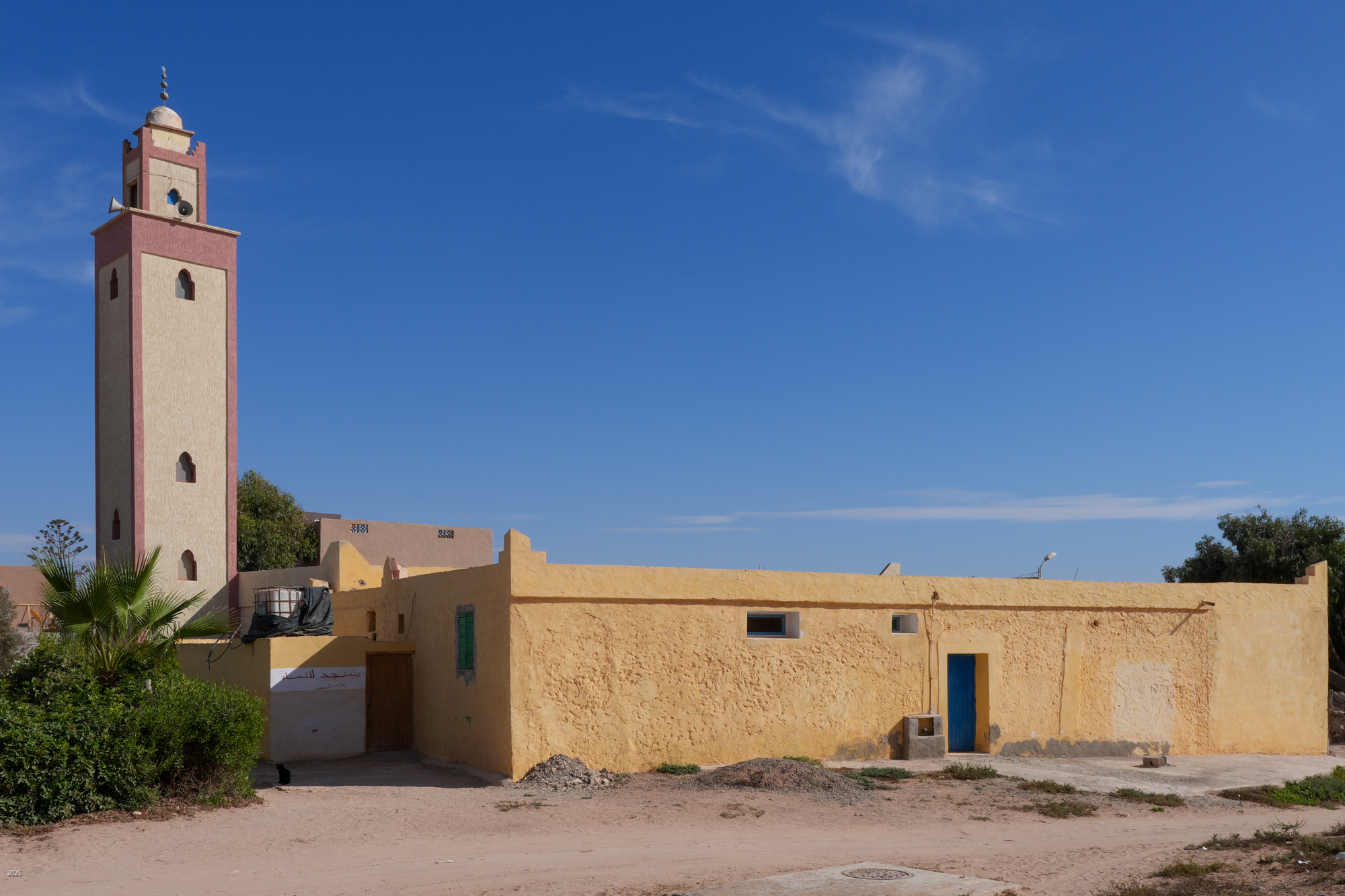 Sidi R'bat has a prominent mosque, like most other villages in Morocco. Calls to prayer are broadcast by loudspeaker regularly from early morning. Mosques in Morocco lack domes and have square minarets, unlike the round minarets found in India.