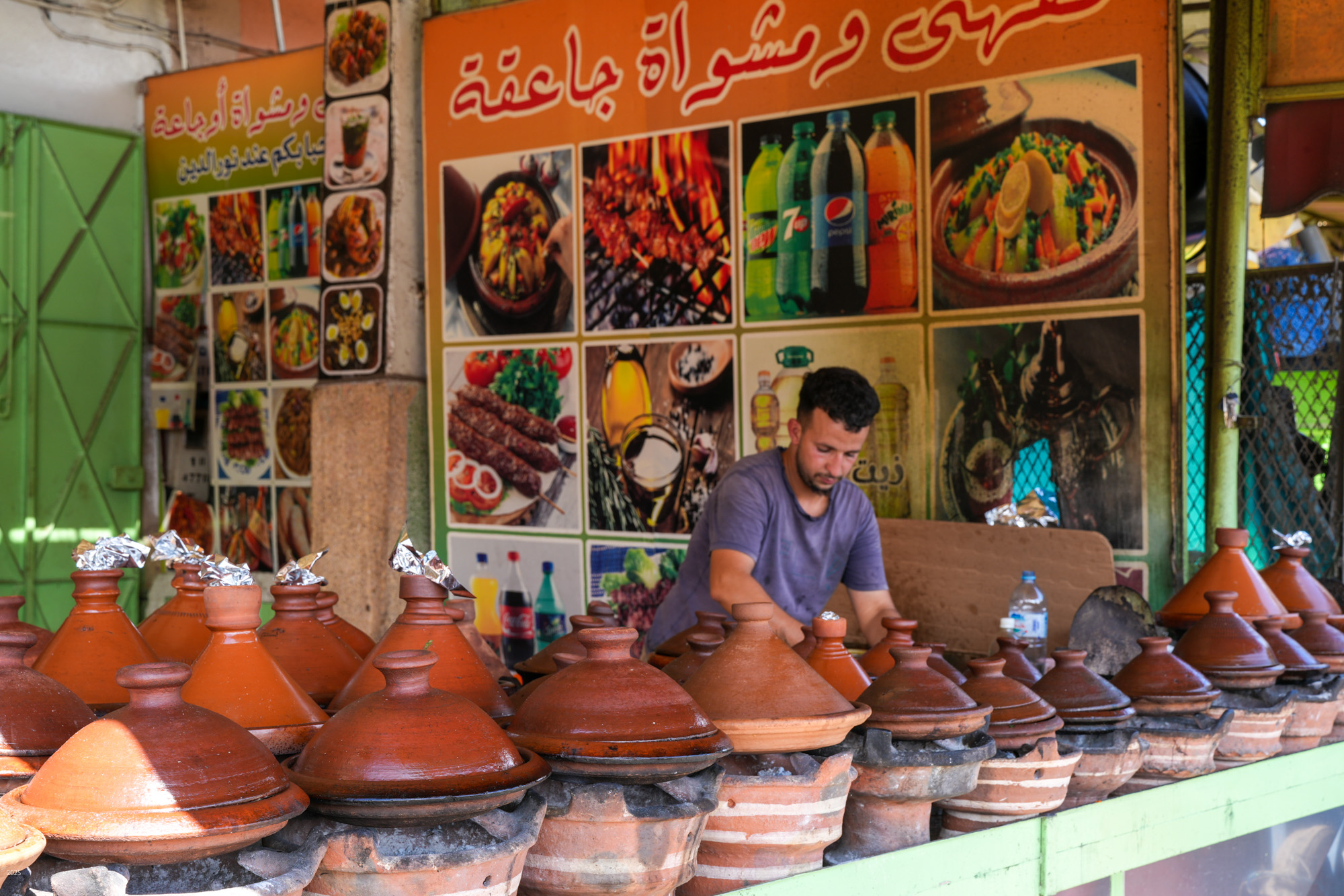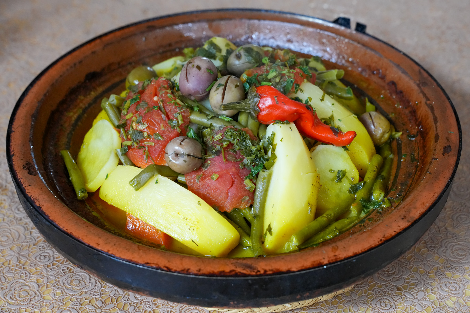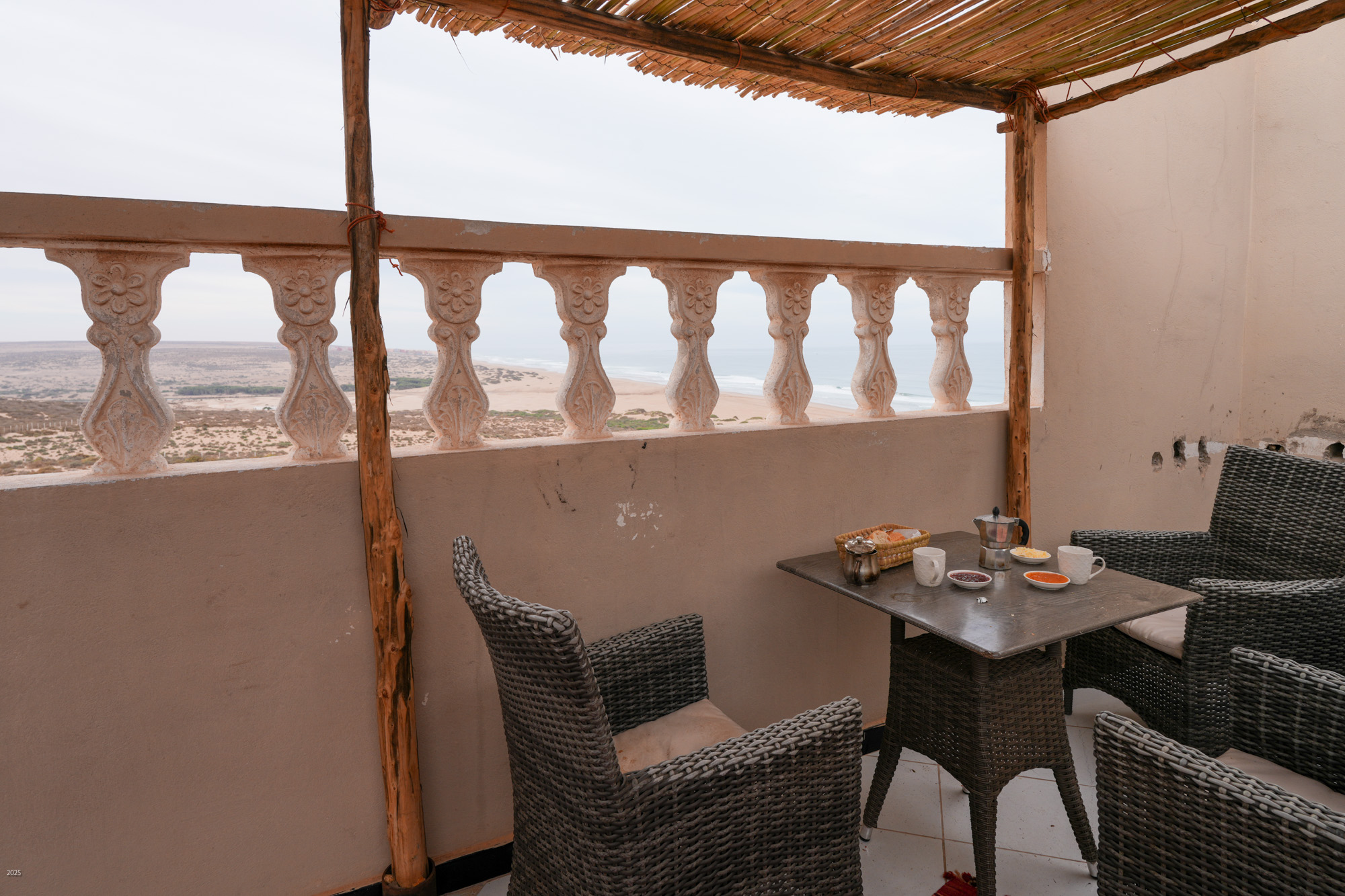 We stayed in Ecotours Massa guest house, a 4-storey building overlooking the beach. There is a small terrace at the top where we had breakfast with a view of the sea. Breakfast was bread with omelette and assorted jams and honey. With sweet Moroccan mint tea and black coffee, with milk on request. For lunch and dinner, we had grilled fish and vegetables, or chicken and vegetables tagine (stew cooked in a clay pot with a raised dome) with some fruit.