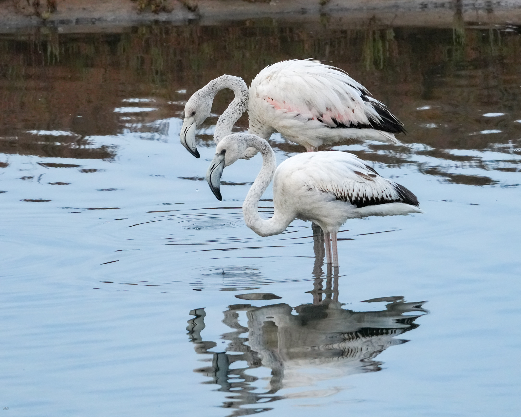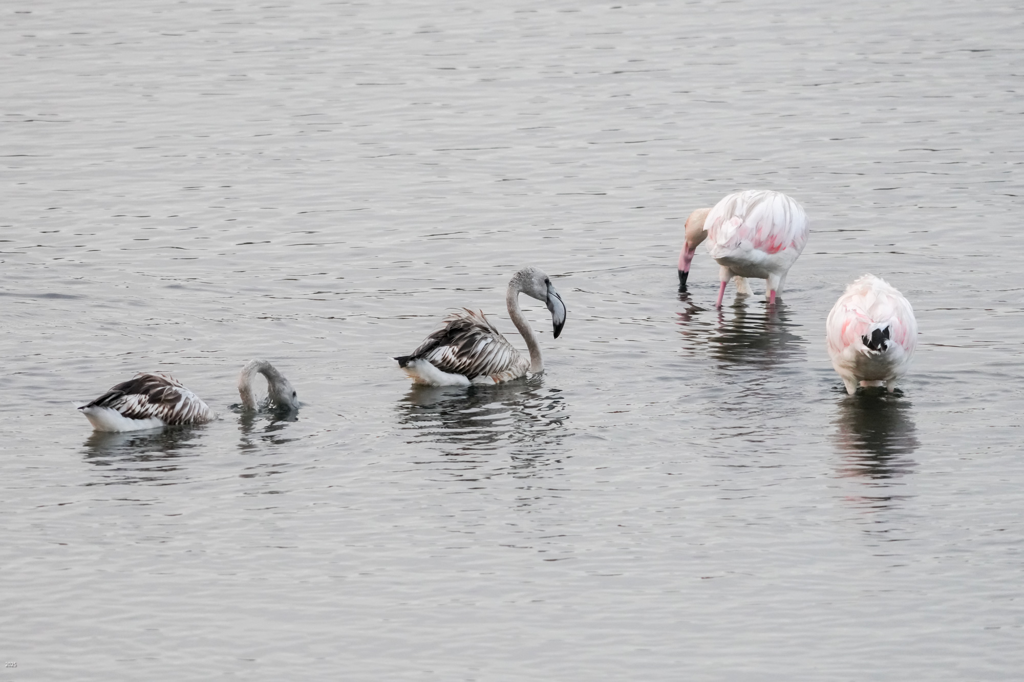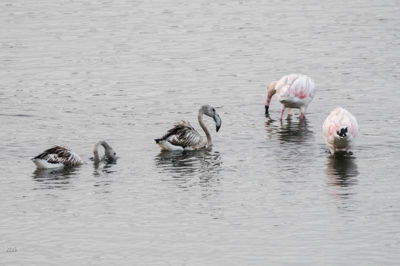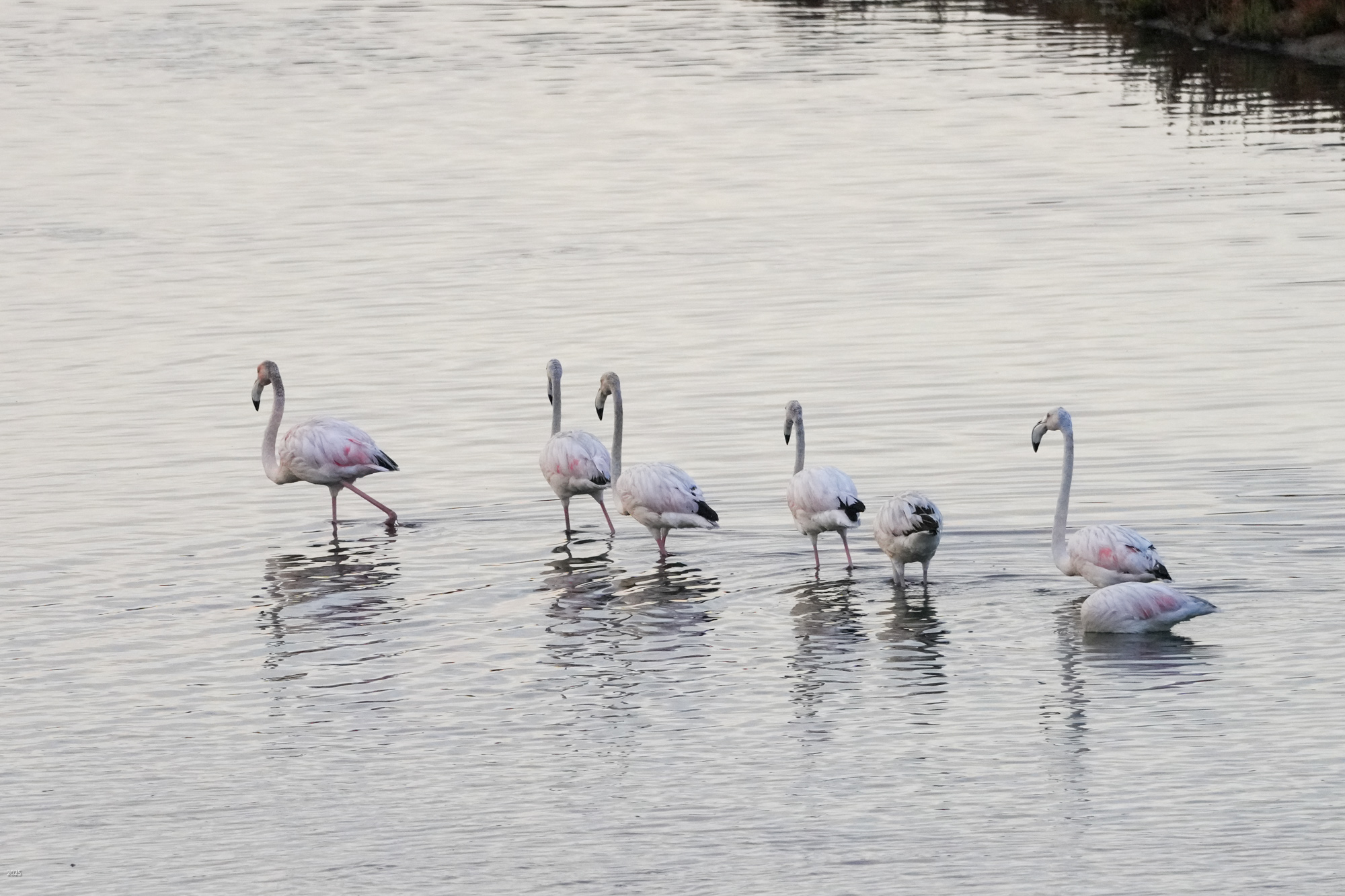 We saw egrets, grey herons, Great flamingos, spoonbills, ducks, grey plovers, black-winged stilts, an osprey, a redstart, sparrows, swallows and bulbuls. The flamingos were mostly white with hints of pink, the degree of pinkness depending on the diet. The pink colour comes from carotene in algae. If the flamingo eats the algae directly, it is more pink. If it eats shrimp which had eaten algae, it is less pink. It may also eat something else that has no carotenoids. See https://en.wikipedia.org/wiki/Flamingo#Feeding
