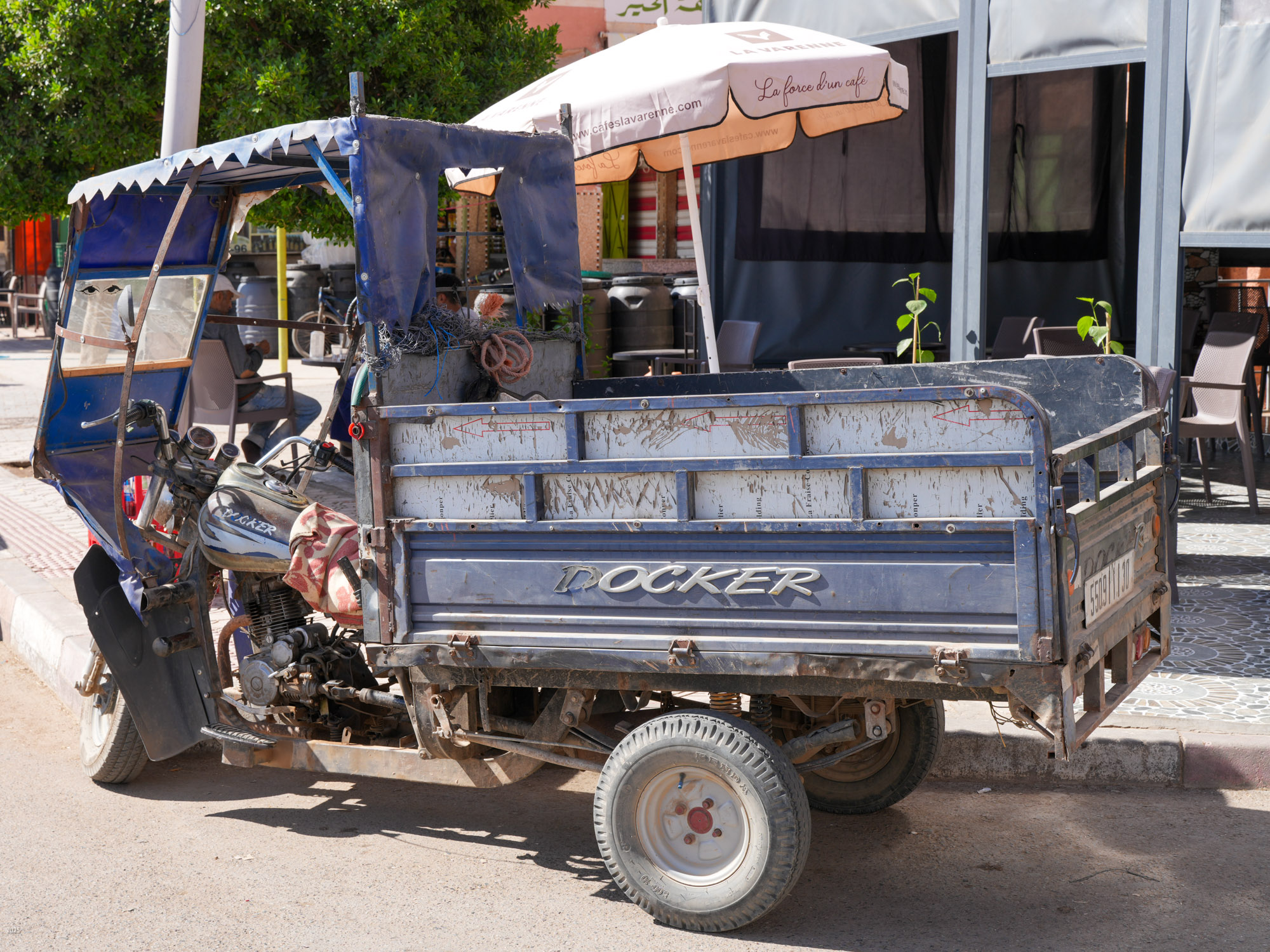 We set off from Agadir airport at 4:45 pm in a pre-booked taxi. With a stop for tea, we reached the Ecotours Massa homestay in Sidi R'bat about 6 pm. The country en route was arid with a few eucalyptus trees, some argan groves, and some covered fields (vegetables, perhaps). Traffic was light and fairly disciplined. Our driver actually drove below the speed limit, something almost unheard of in India. At the frequent roundabouts, vehicles in the roundabout get priority. The trucks are mostly European tractor-trailer rigs. Vehicles are a mix of European and many Dacia manufactured in Morocco. Dacia is a Romanian brand that is now owned by Renault. Motor bikes are less common than in India, they are more used in less affluent rural areas. Drivers rarely wear helmets and ride at breakneck speeds. A few Docker 3-wheelers are used for goods transport in rural areas. Docker is a local make, probably based on a Chinese design and parts.