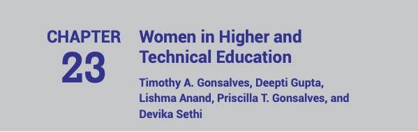 India Gender Report, Chap 23: Women in Higher and Technical Education, pp. 275-291, a report on India’s progress in higher education from a gender perspective during the decade 2012 – 2021. By Timothy A. Gonsalves, Devika Sethi, et al. FPC, 2024 (rev. 1, updated 3/5/2025 with corrections on pages 276, 277 and 282.)